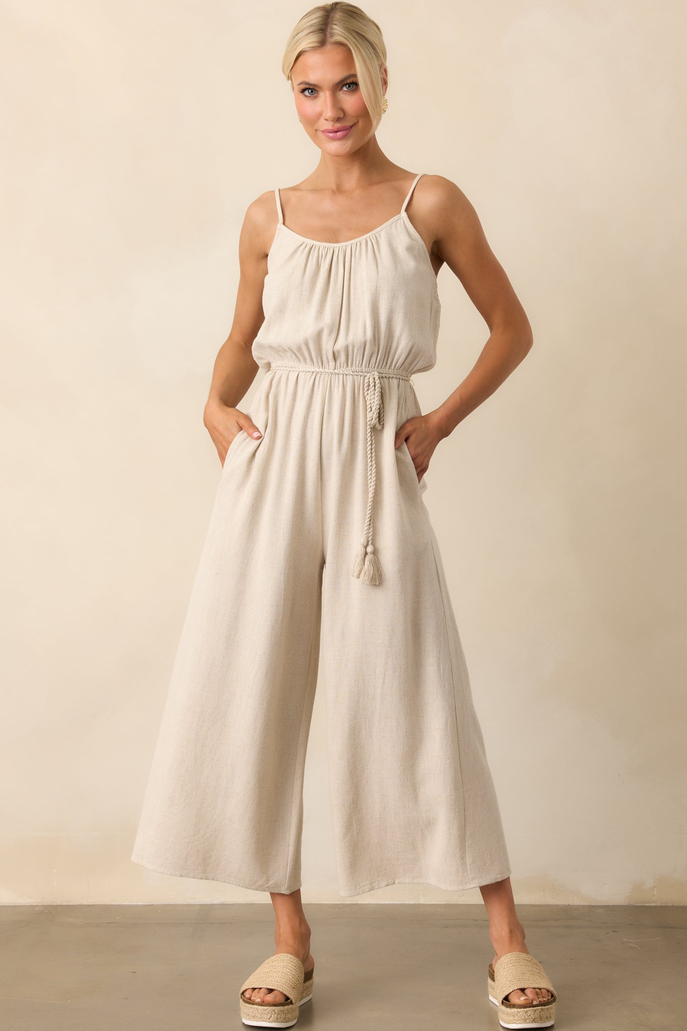 The As Simple As That Natural Linen Blend Sleeveless Jumpsuit is perfect for days when you want your look to feel both relaxed and refined. With an easy elegance, it’s a versatile choice for casual outings, weekend plans, or a laid-back lunch date. This natural beige jumpsuit features a scoop neckline, adjustable spaghetti straps, smocked back panel, elastic waist, optional self-tie rope belt with fringe tassels, wide leg design, and functional pockets.