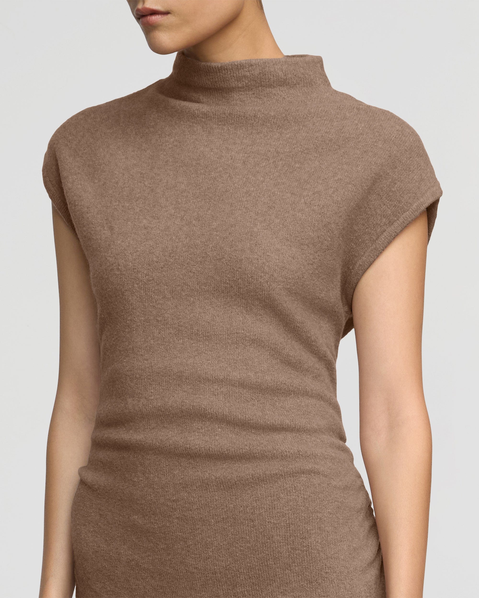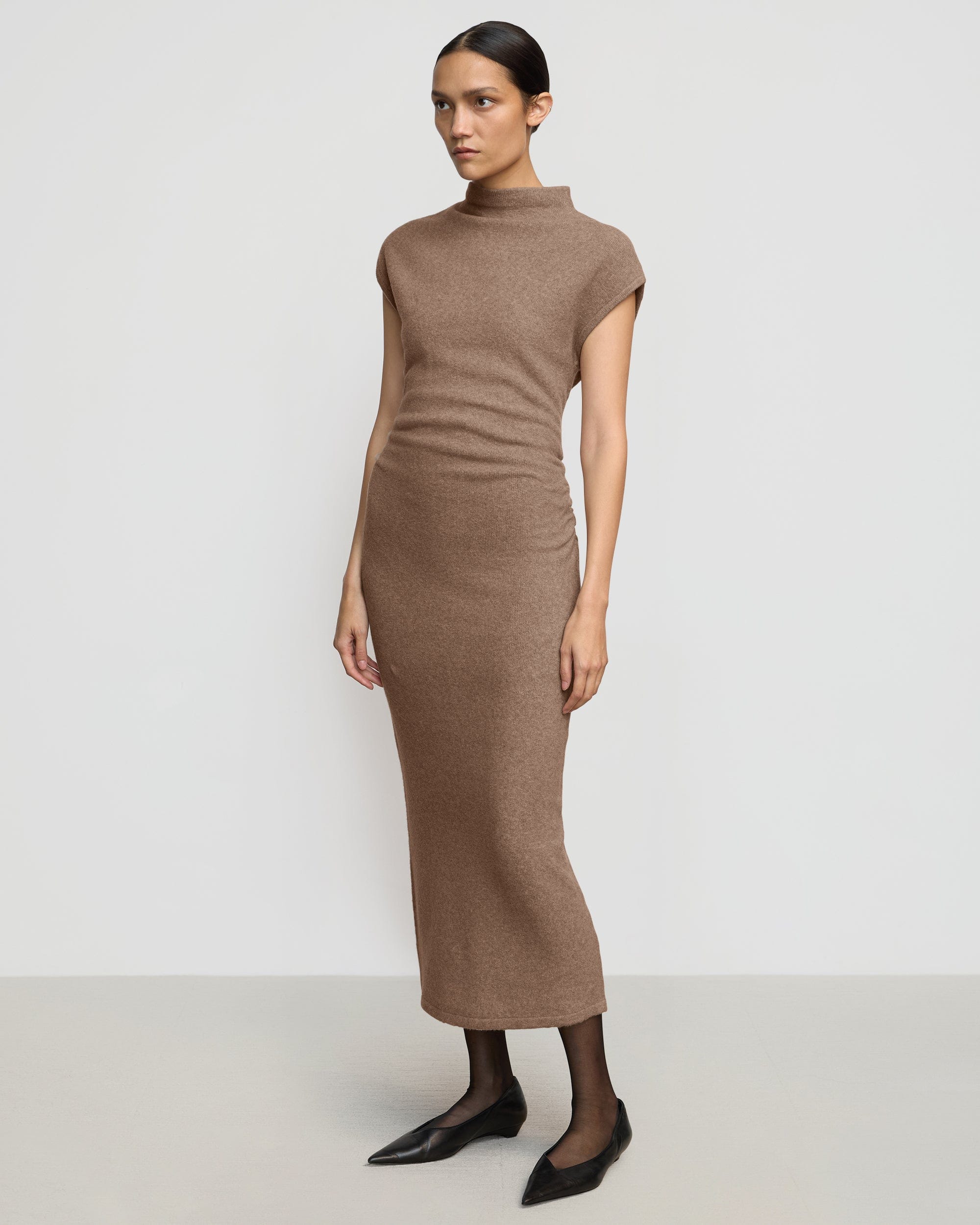 A cozy and chic mock-neck sweater dress featuring ruched side seams. Made from a super soft eco-conscious knit, Caspia effortlessly combines comfort with style.