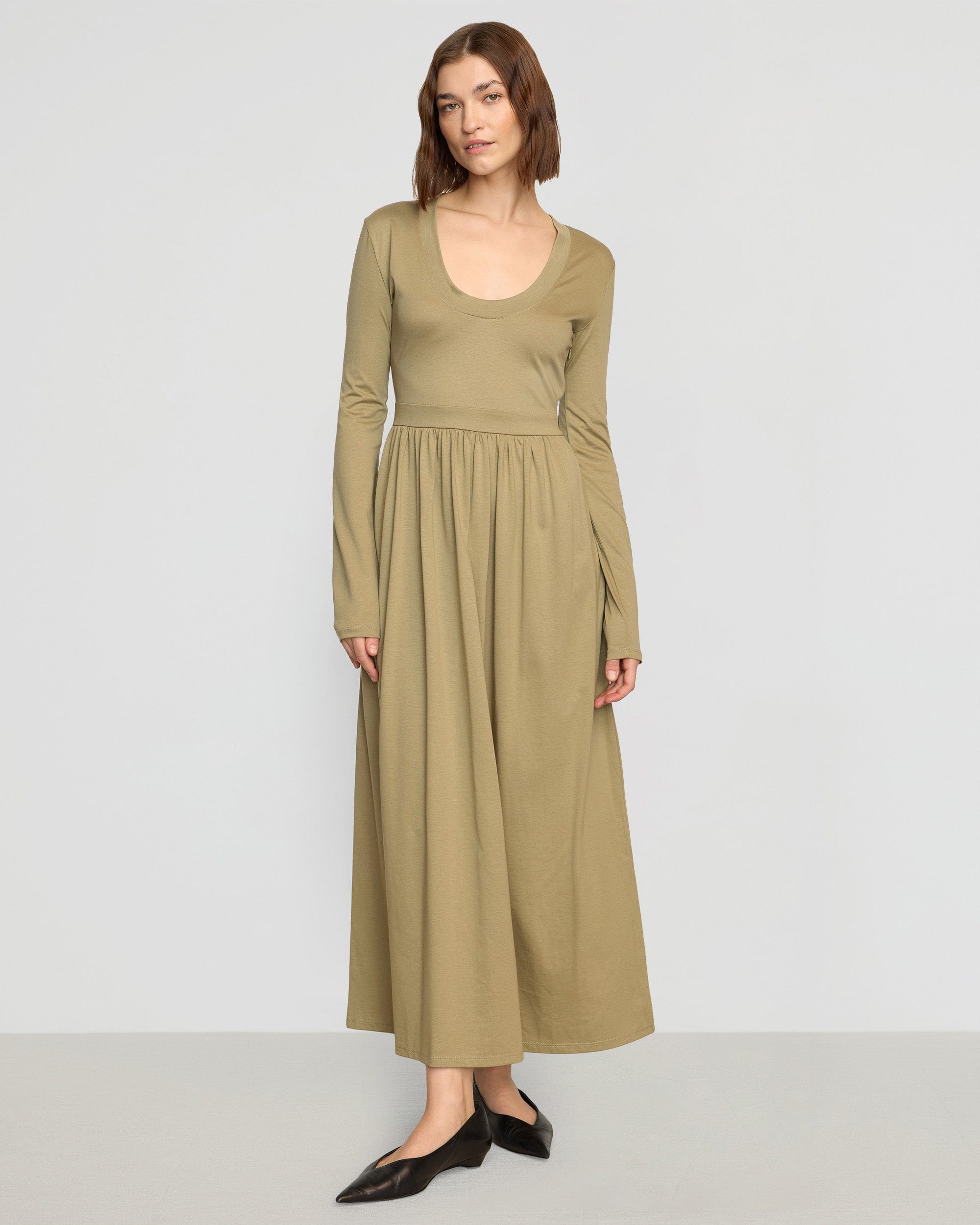 An ultra-flattering U-Neck long-sleeve jersey dress — featuring a high waist and gathered skirt detail. Cherie is an easy solution for any upcoming occasion.