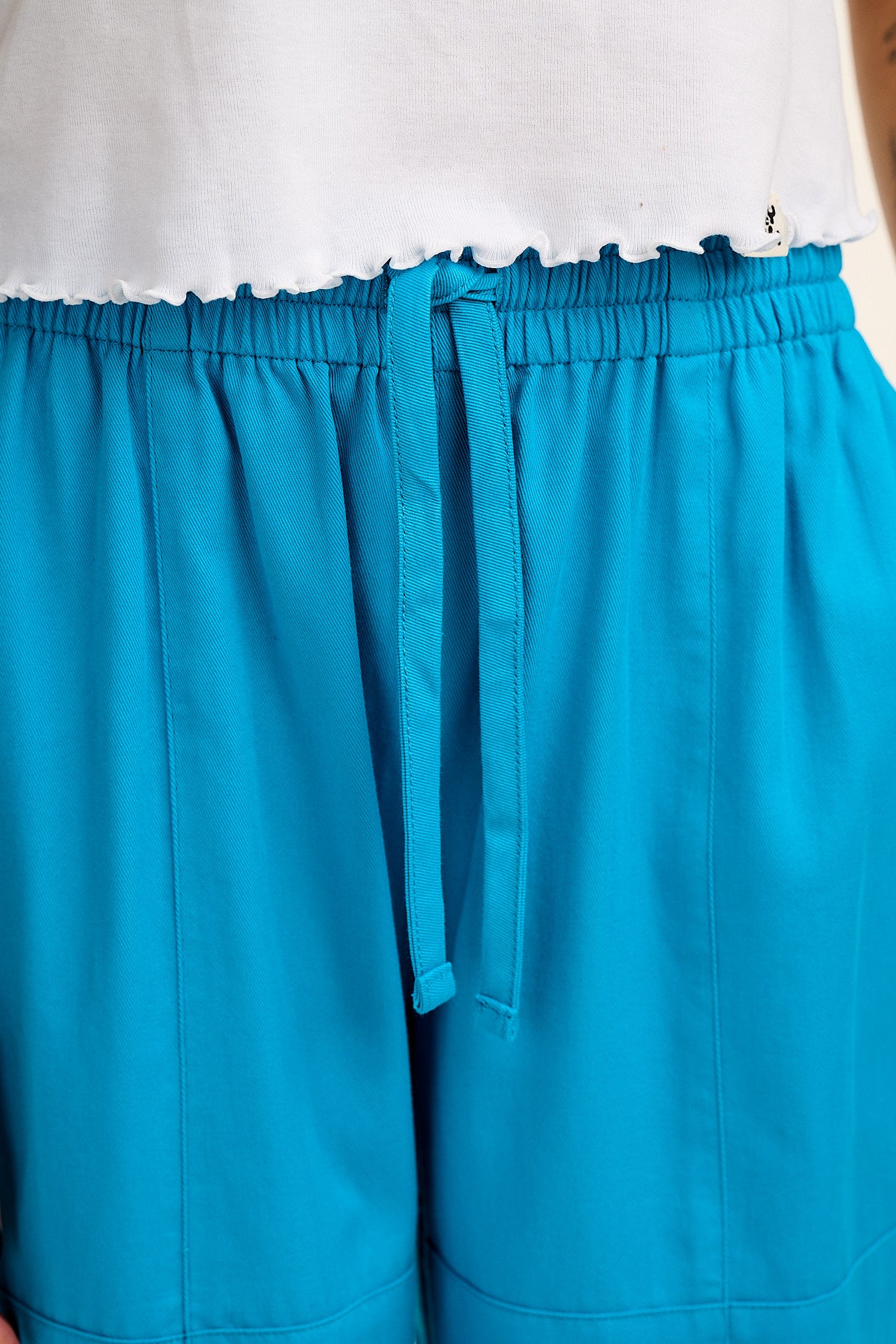 Chuck is our relaxed trousers with elasticated waist and drawstring ties. Cropped length.