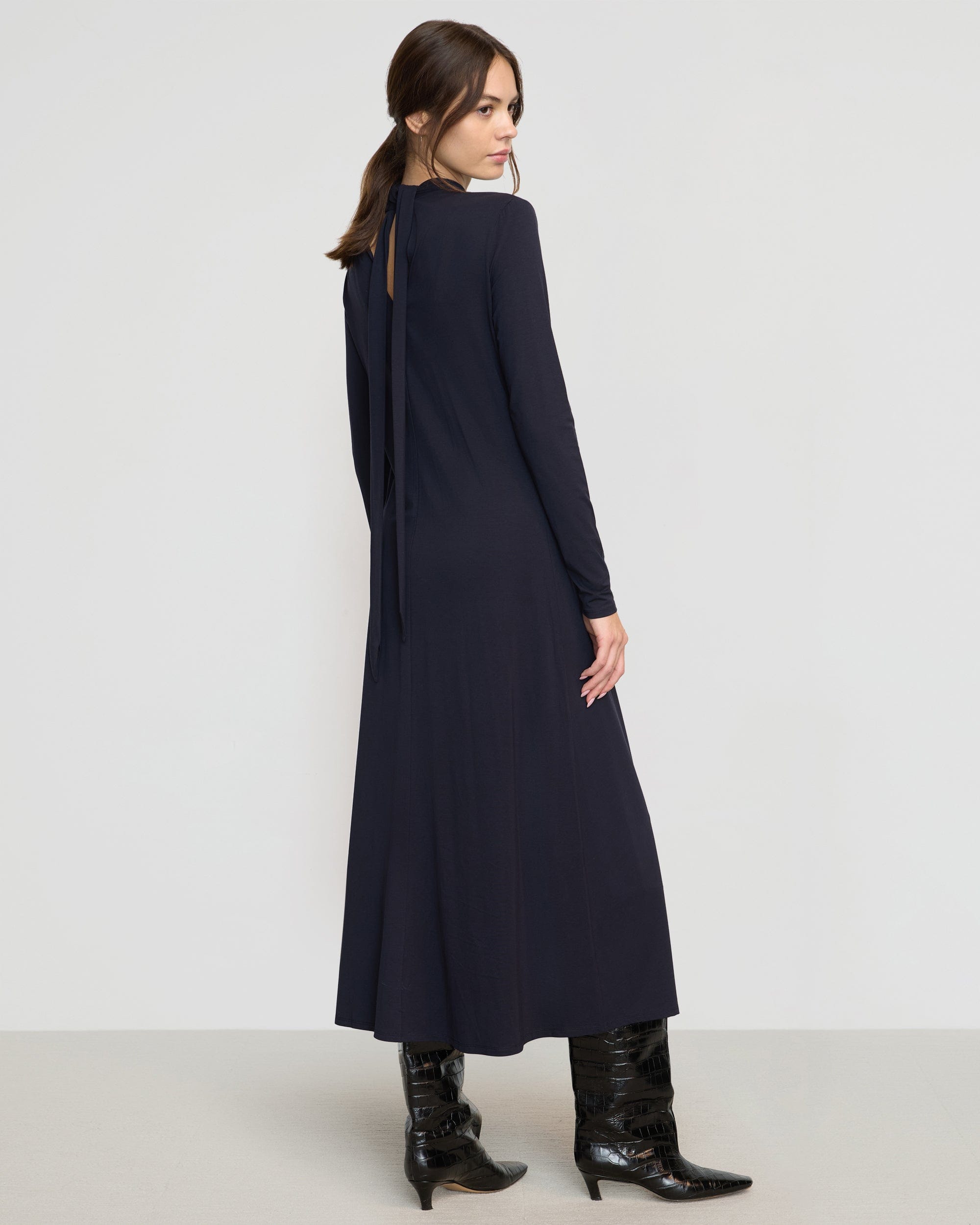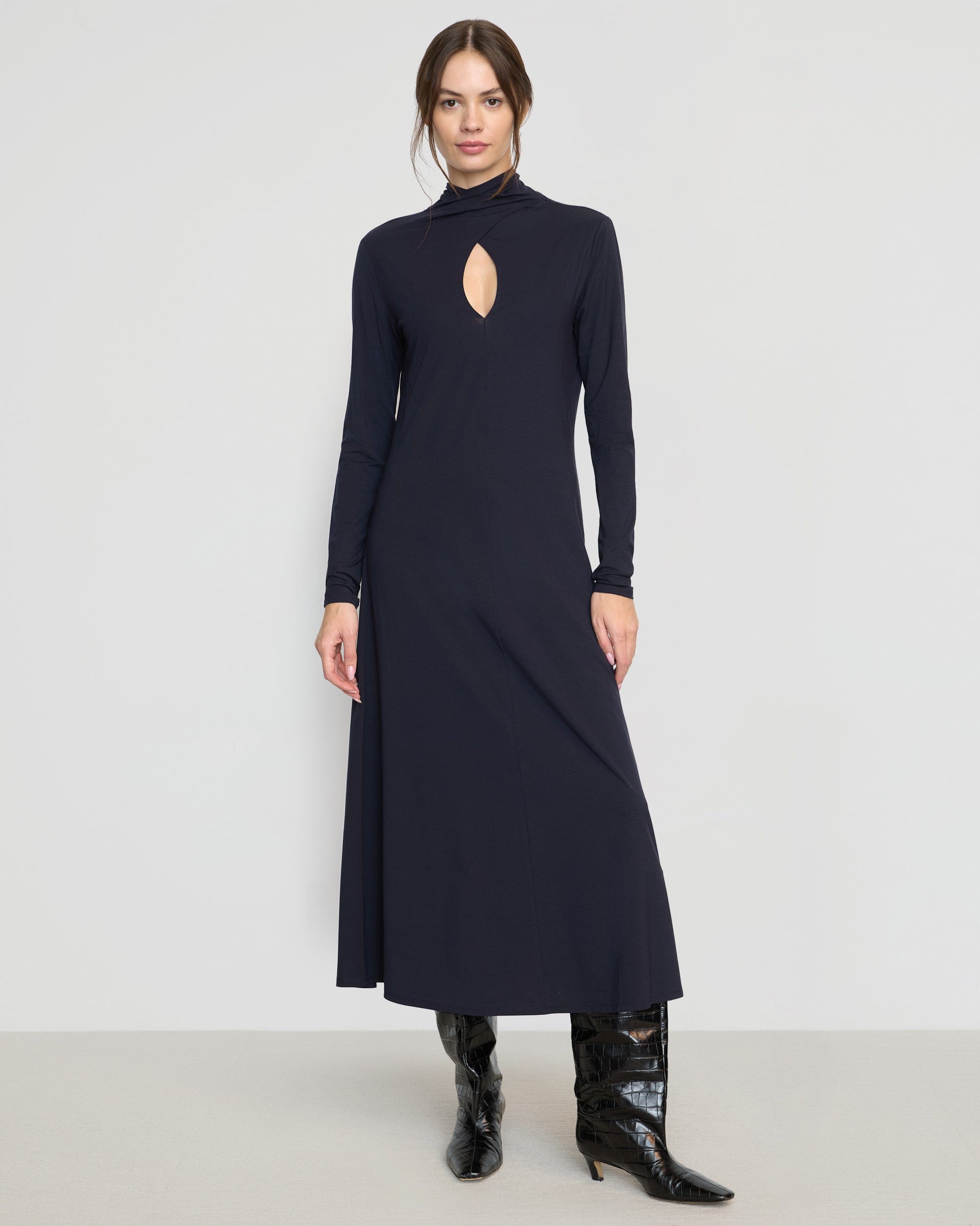 A chic and streamlined knit jersey dress with a scarf wrap neck creating a keyhole detail. Helena is an effortless solution for any upcoming occasion.