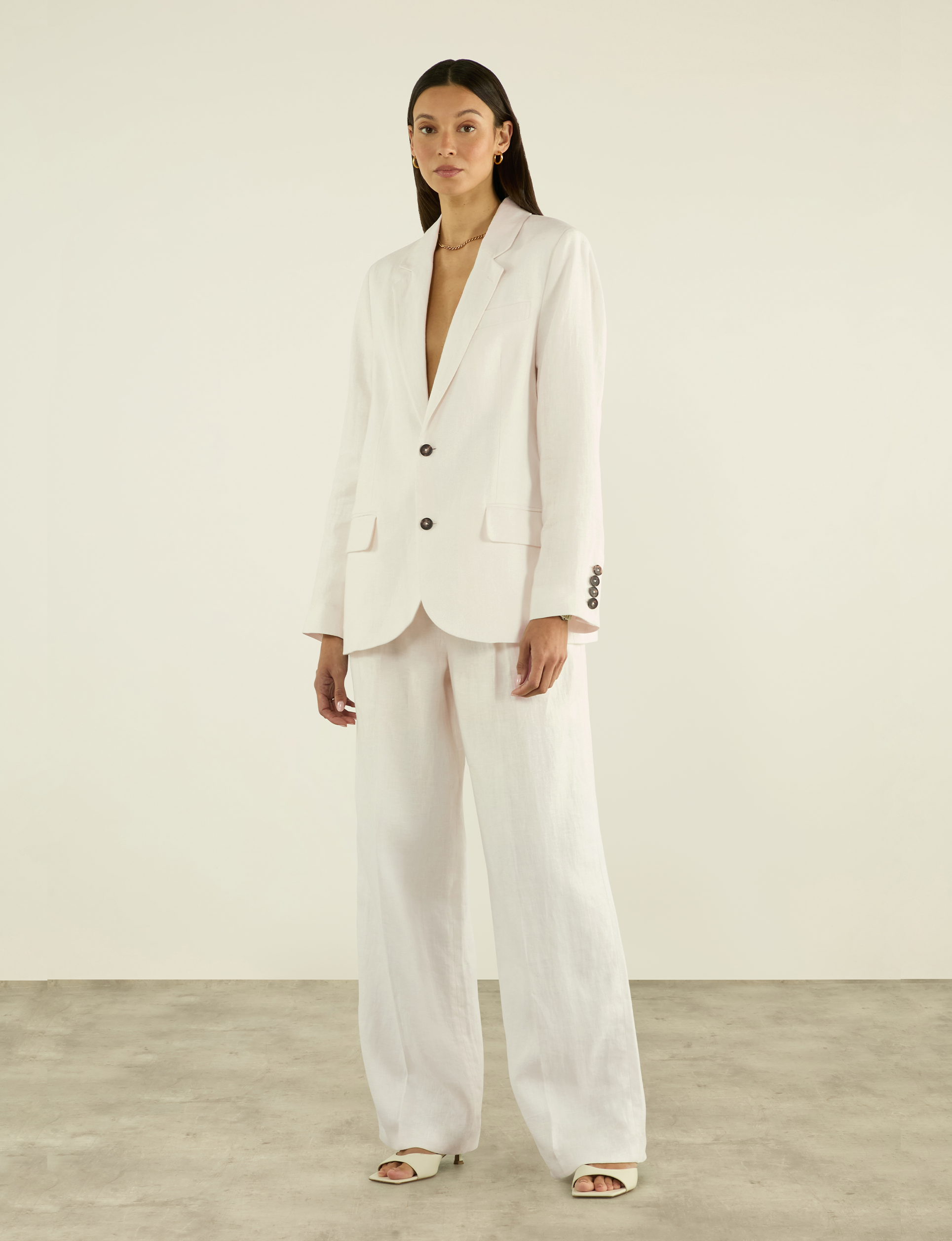 Hutton Blazer: Linen, Ivory. A warm-weather-worthy iteration of our timeless, tailored blazer crafted from a midweight Irish Linen, perfect for a slightly smarter finish. The single breasted, boxy style based on men’s tailoring is cut to flatter the female form. Sport a Summer suit by pairing with matching linen trousers or throw over black tailored shorts and a white tank for a simple, sophisticated look. Designed in London, made in Portugal.