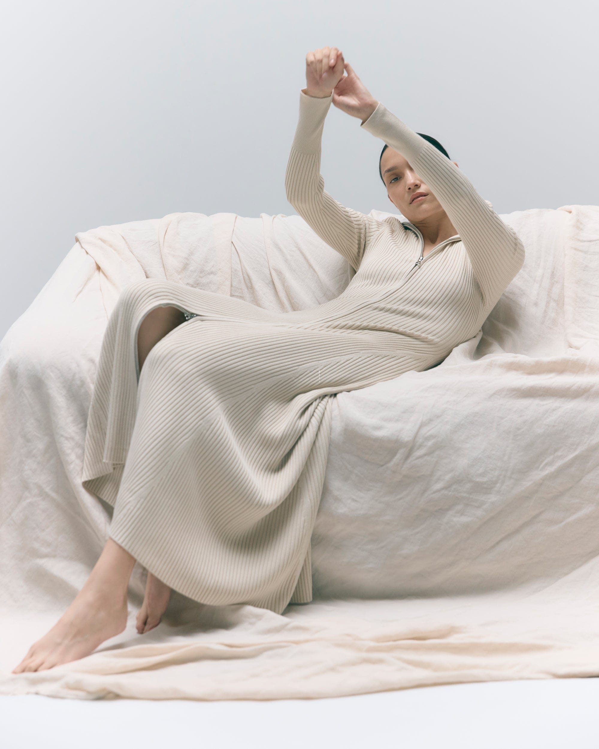 Our modern take on the sweater dress — featuring a versatile and chic two-way zip and statement ribbed detailing, Janne effortlessly blends comfort and style.