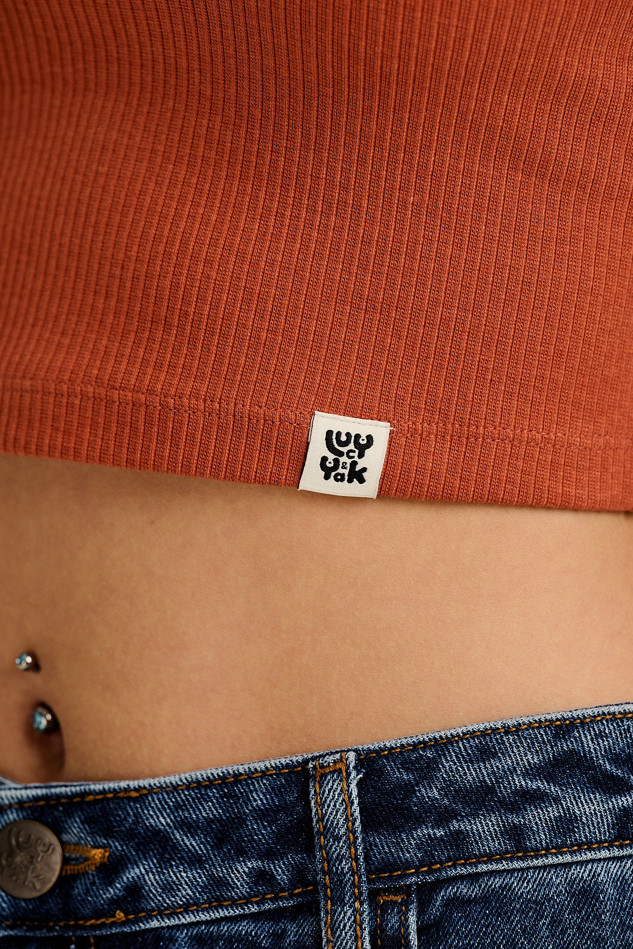 Josy is our scoop neck fitted vest, with a cropped length to wear with our high-waist trousers, available in Terracotta!