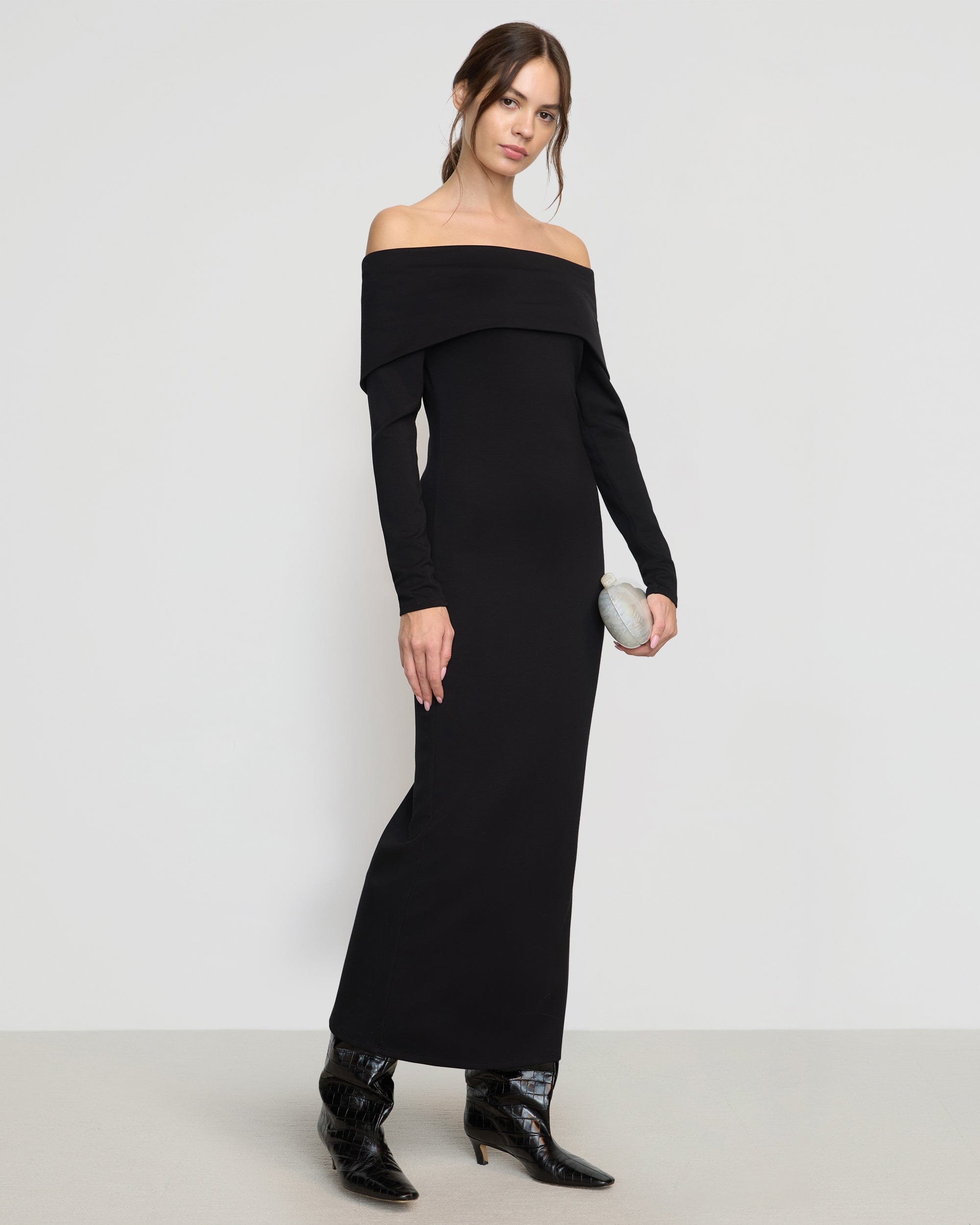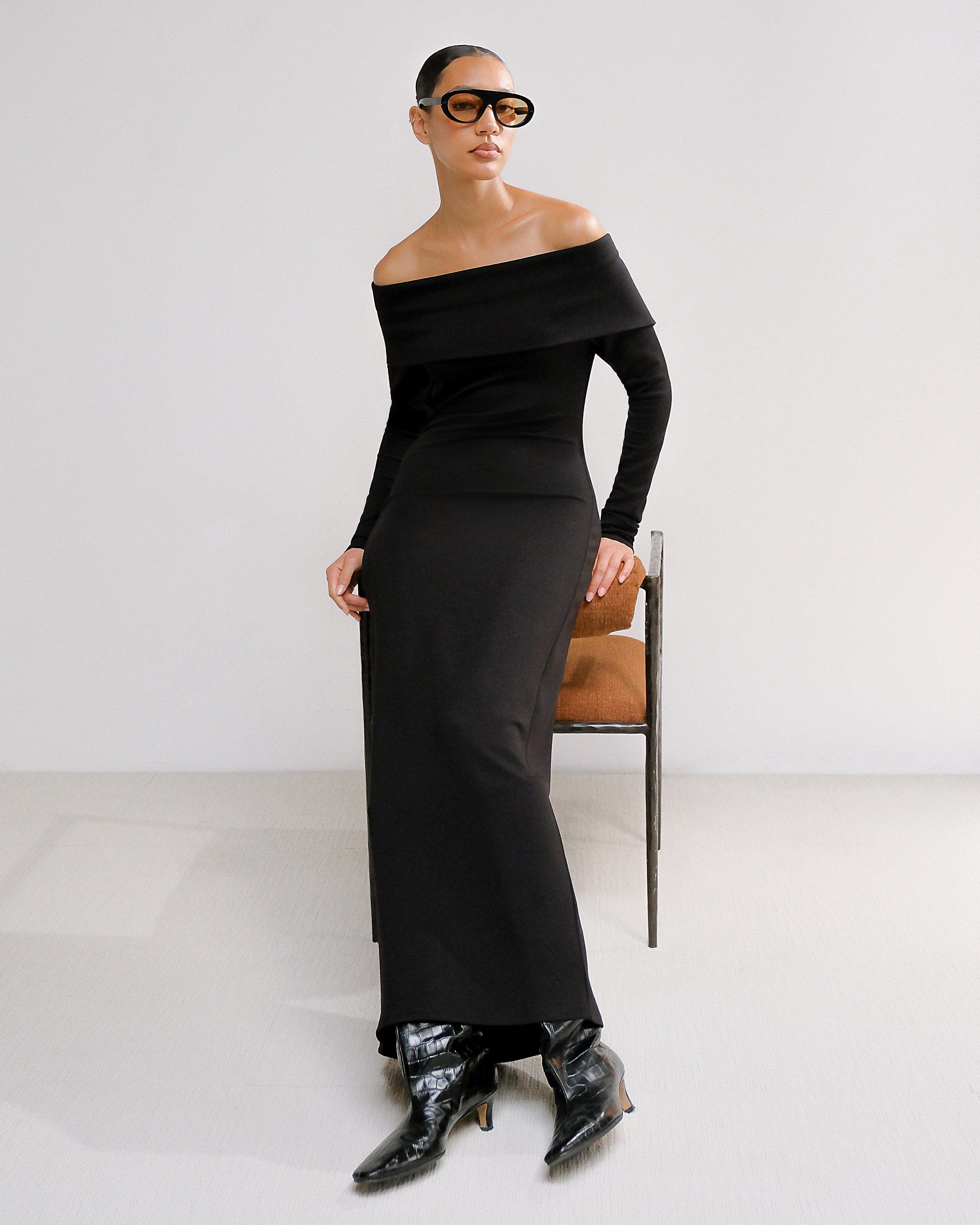 A sleek, design-forward take on the essential maxi dress — Morgan features a flattering foldover off-shoulder neckline and cozy long sleeves. We love to wear this piece to make a chic statement for any upcoming events.