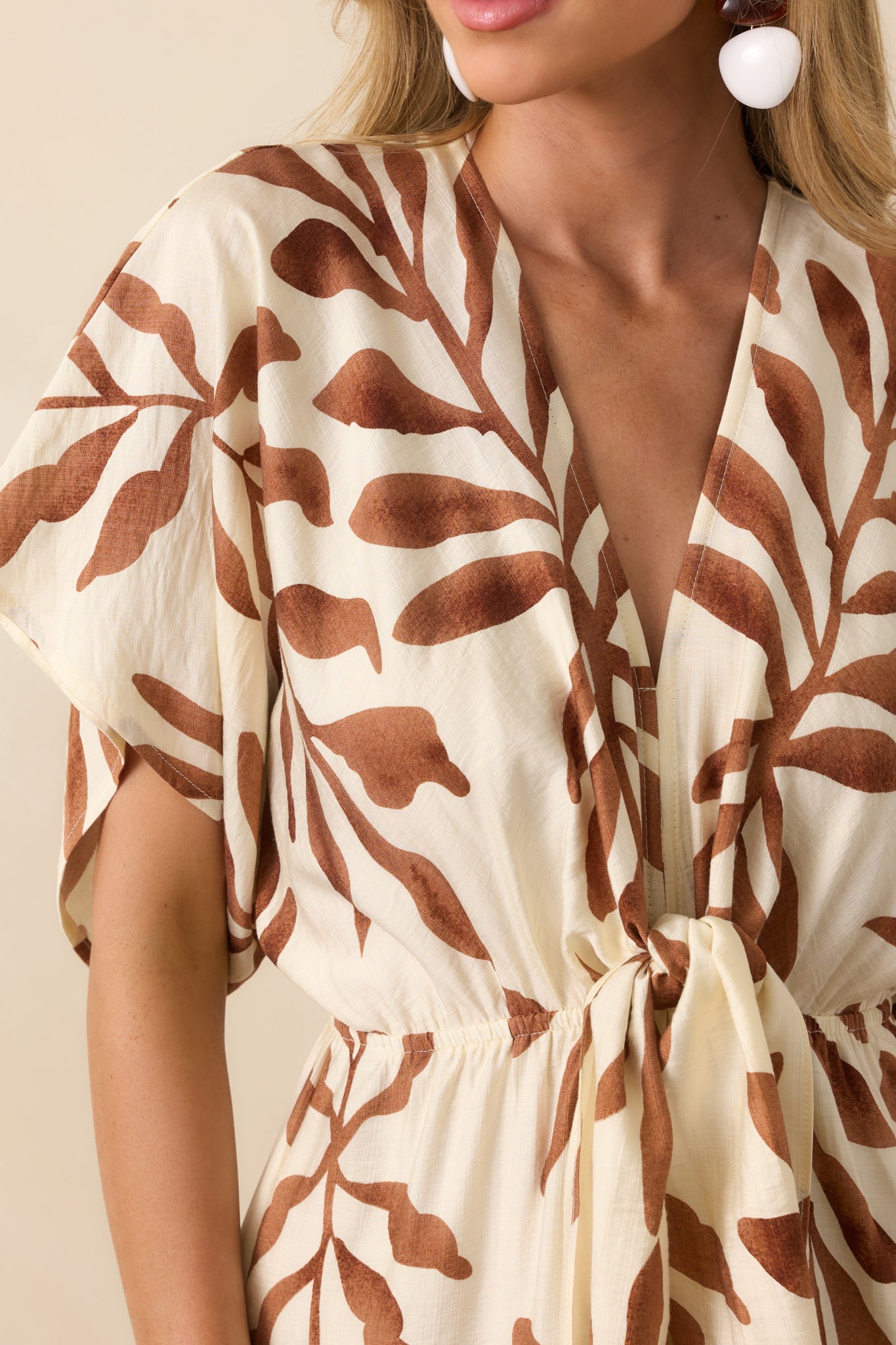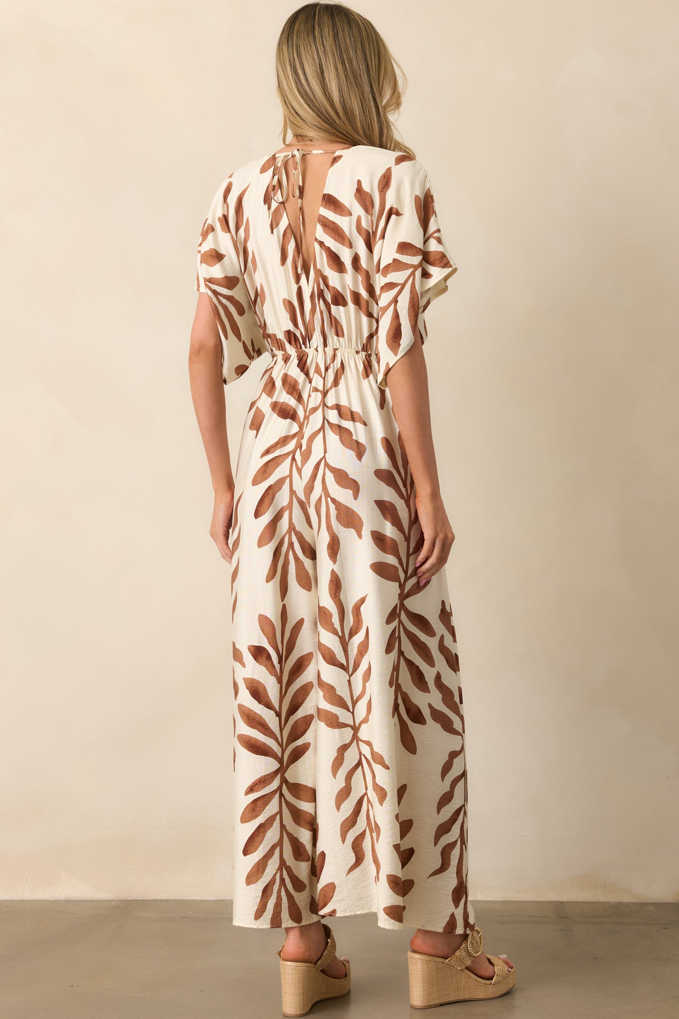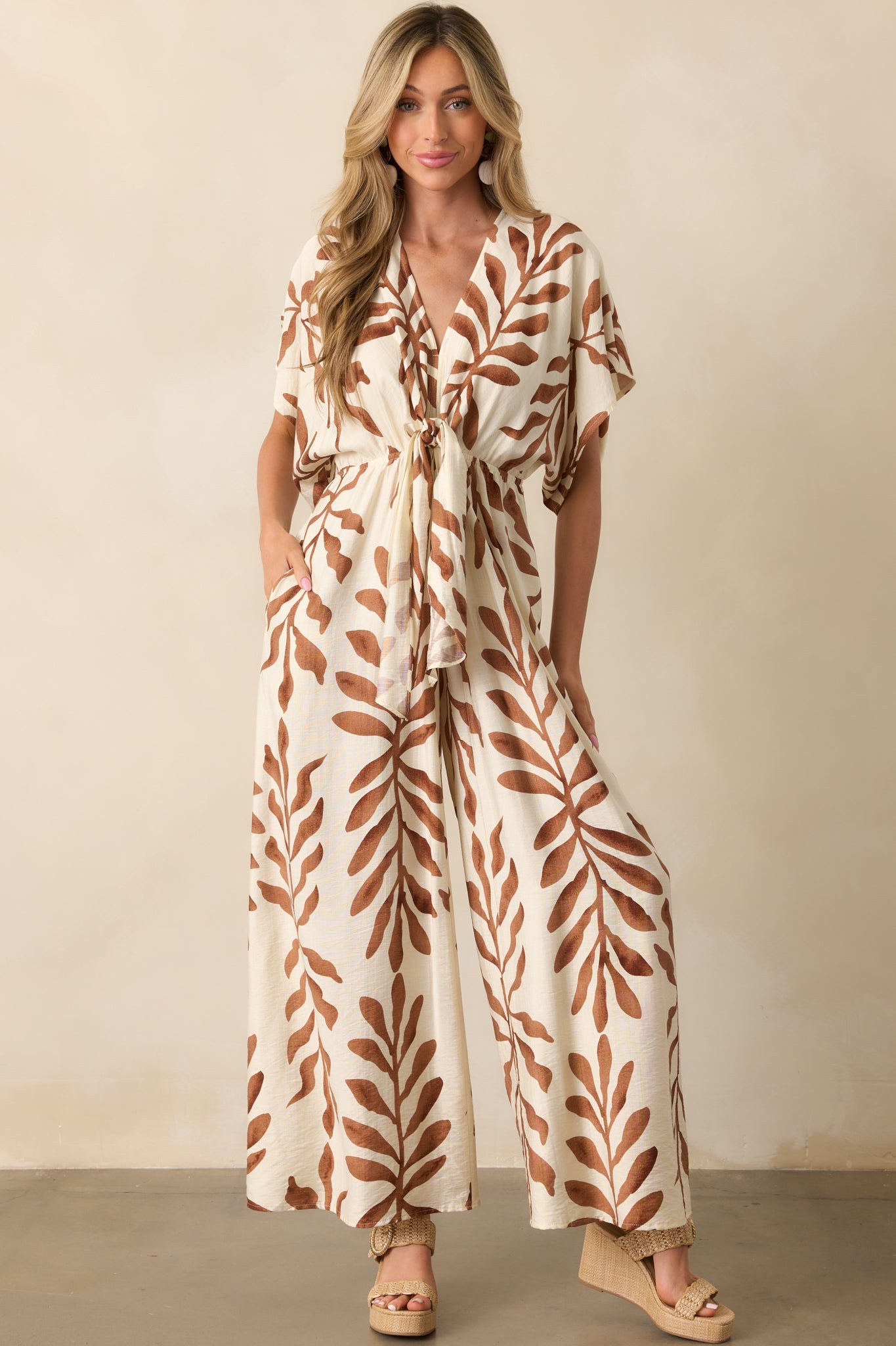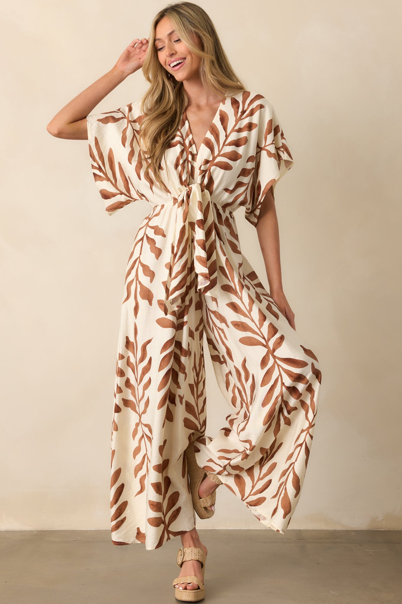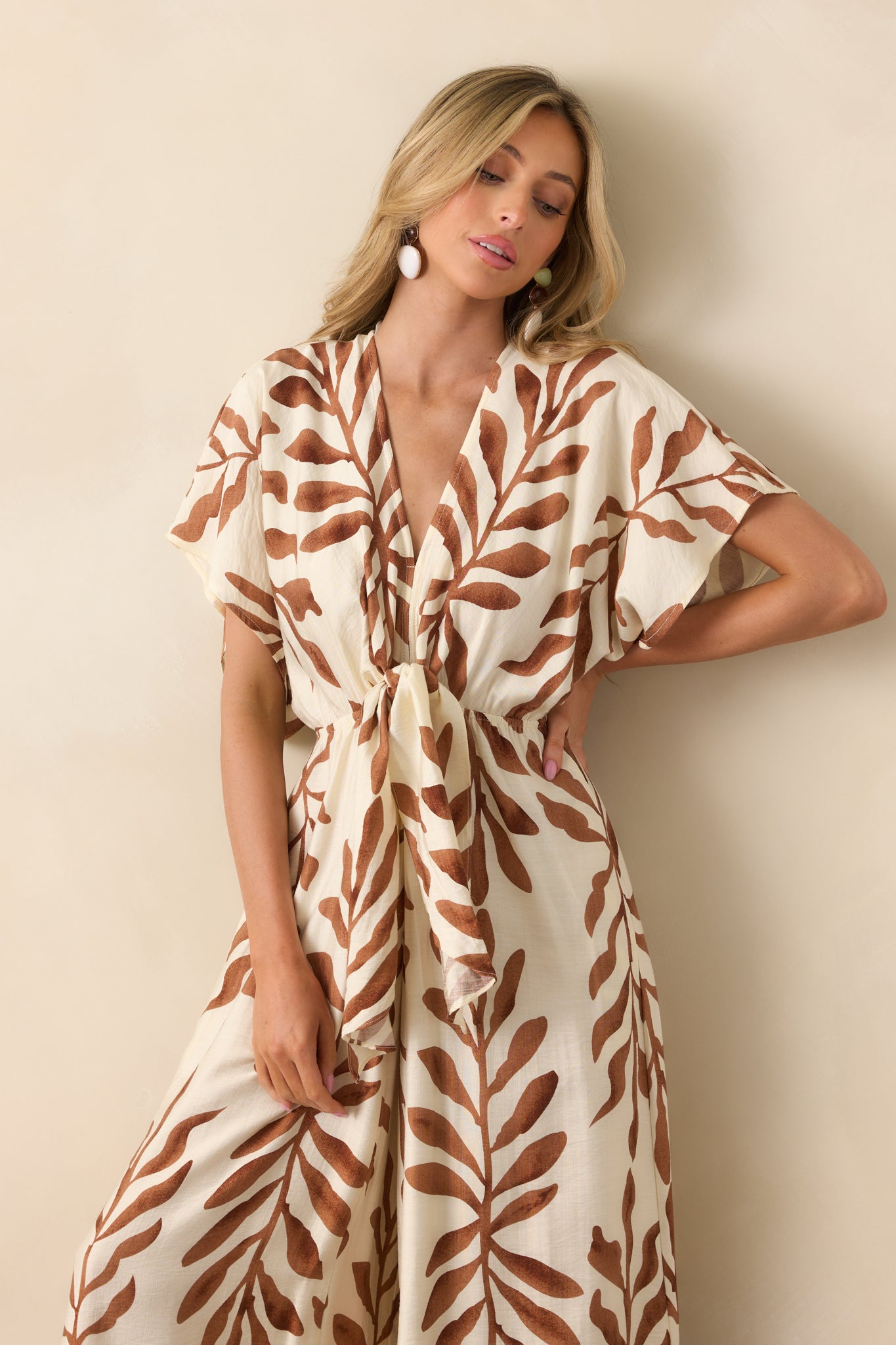 The Stepping Into Greatness Light Brown Botanical Print Jumpsuit is for days when you’re feeling confident and ready for anything. With a mix of sophistication and ease, it’s a versatile choice for making a statement while staying comfortable and stylish. This jumpsuit features a light brown botanical print, a v-neckline, short kimono sleeves, elastic waist, self-tie front knot, v-beck with self-tie closure, wide legs, and functional pockets.