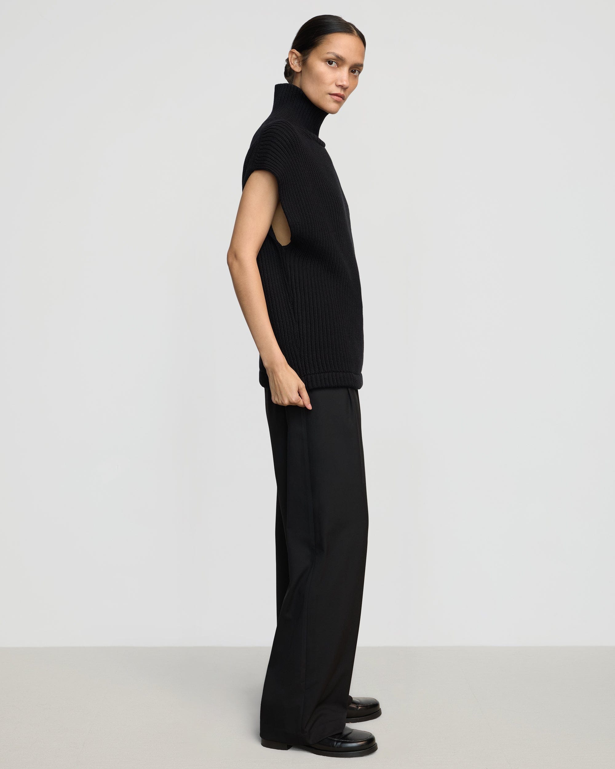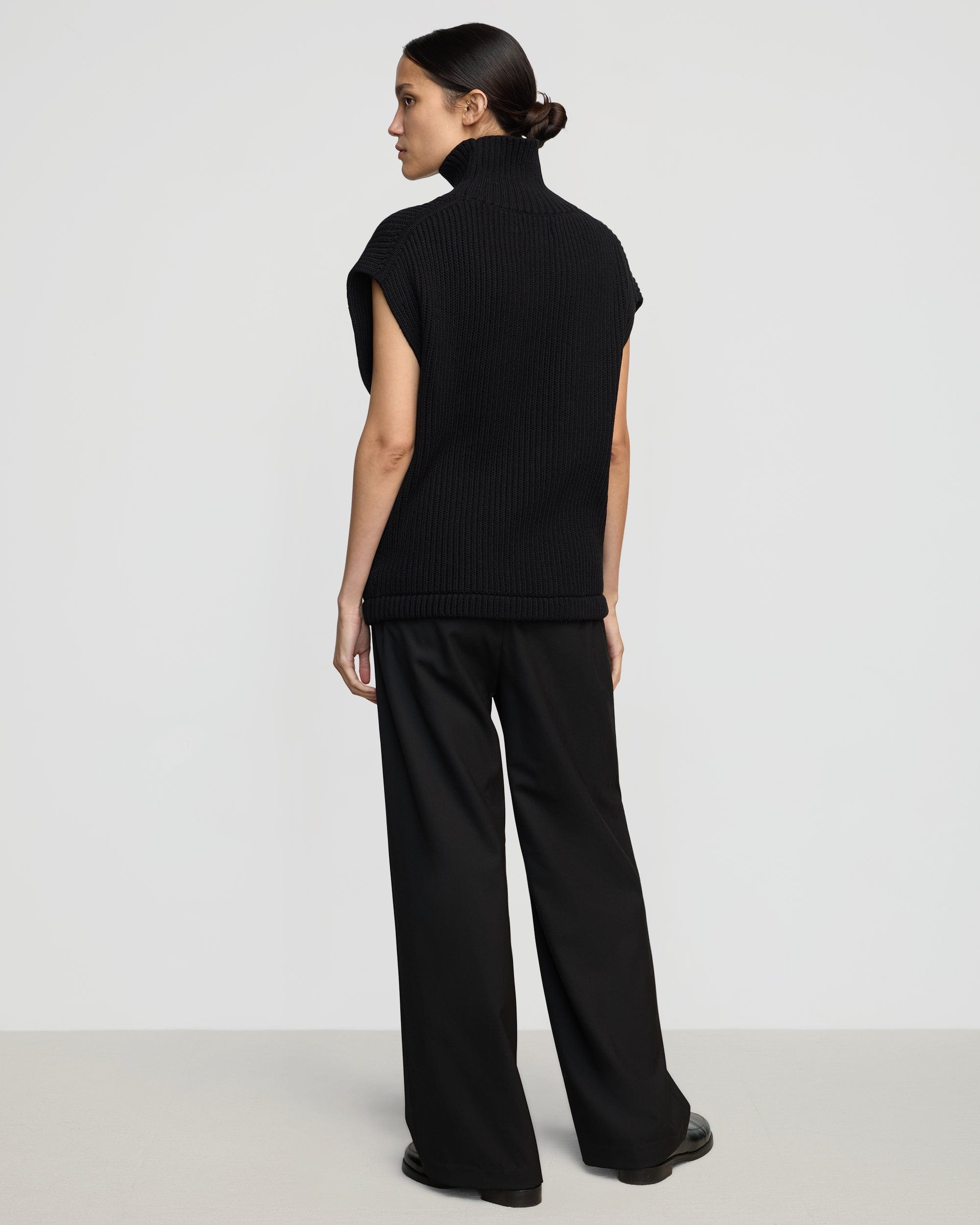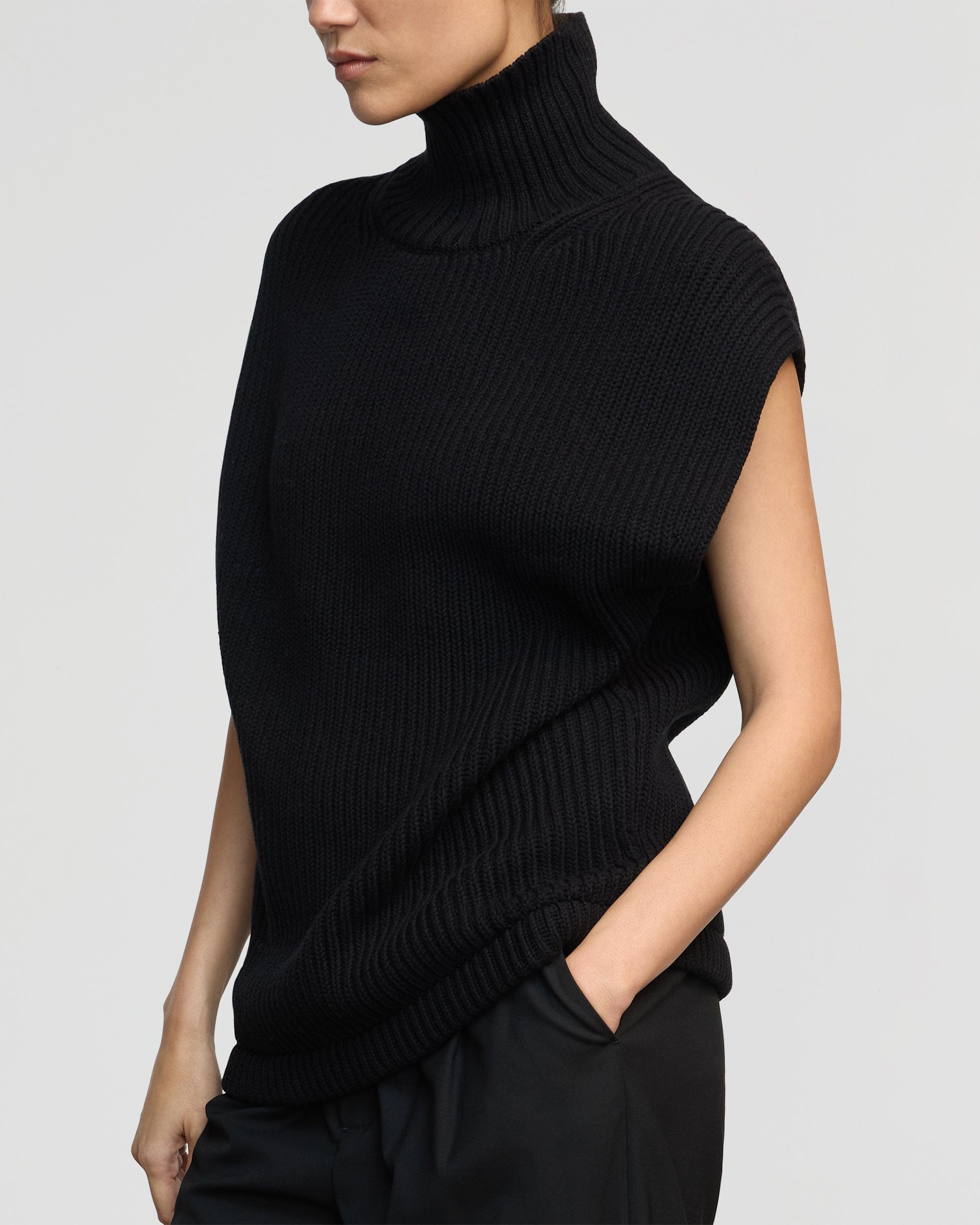 An architectural thick ribbed turtle-neck vest. We’d style her with anything from casual denim for a polished yet relaxed look, or a pop of color for a chic statement.?
