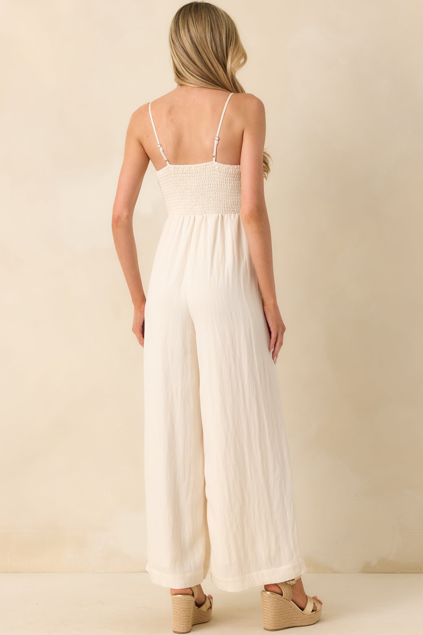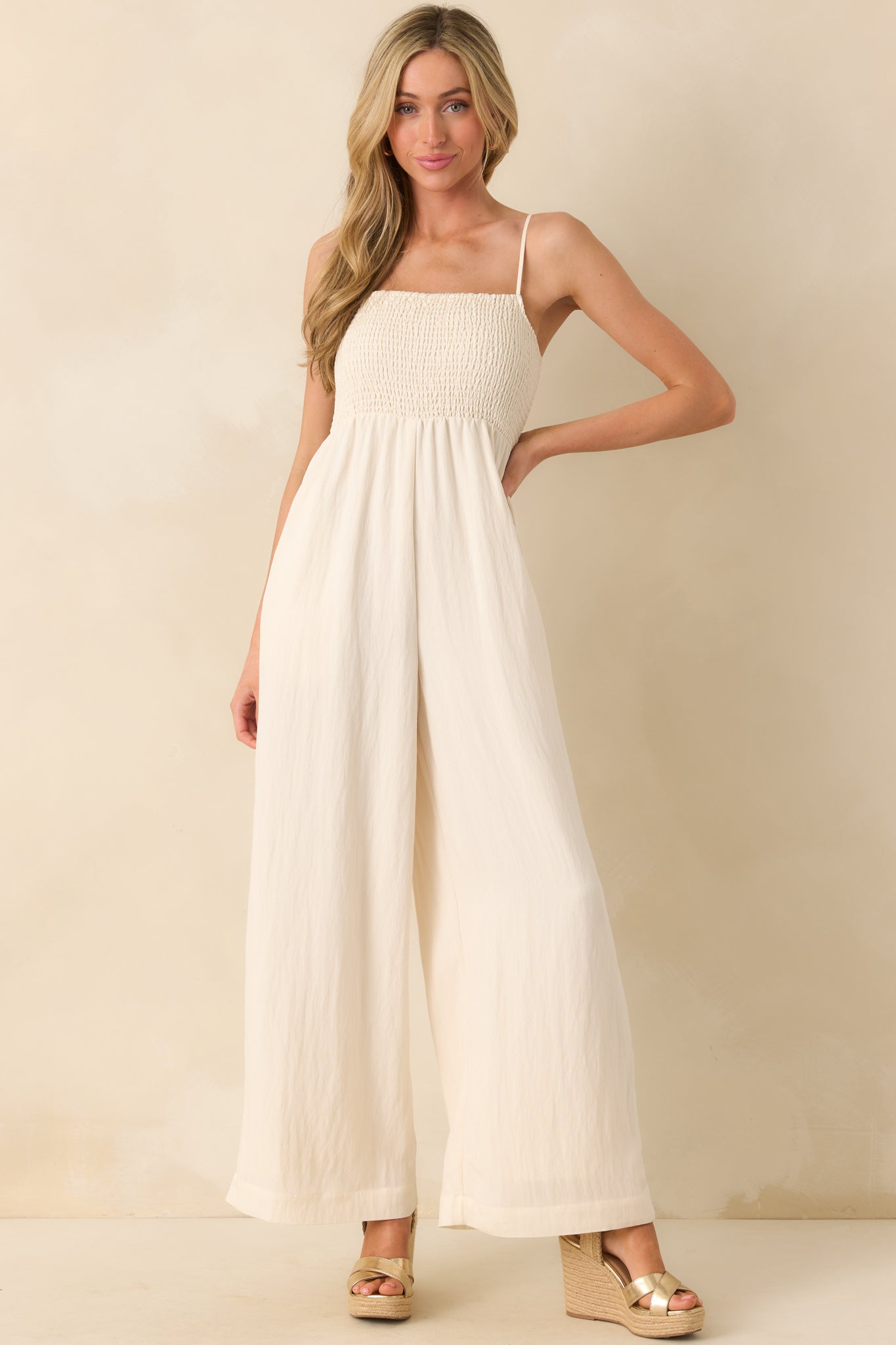 The Z Supply Ivory Rayon Beachside Smocked Jumpsuit is made for salt air, sunshine, and days that unfold at their own pace. Effortless and easy to wear, it’s the kind of piece that feels like vacation no matter where you are. This ivory jumpsuit features a fully smocked bust, square neckline, adjustable spaghetti straps, lightweight rayon blend fabric, wide ankle length legs, full ivory lining, and functional side seam pockets.